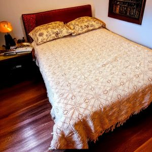 Kaunis heegeldatud voodikate õrna pitsilise mustriga lisab magamistuppa pehmust, valgust ja ajatut kodusoojust.