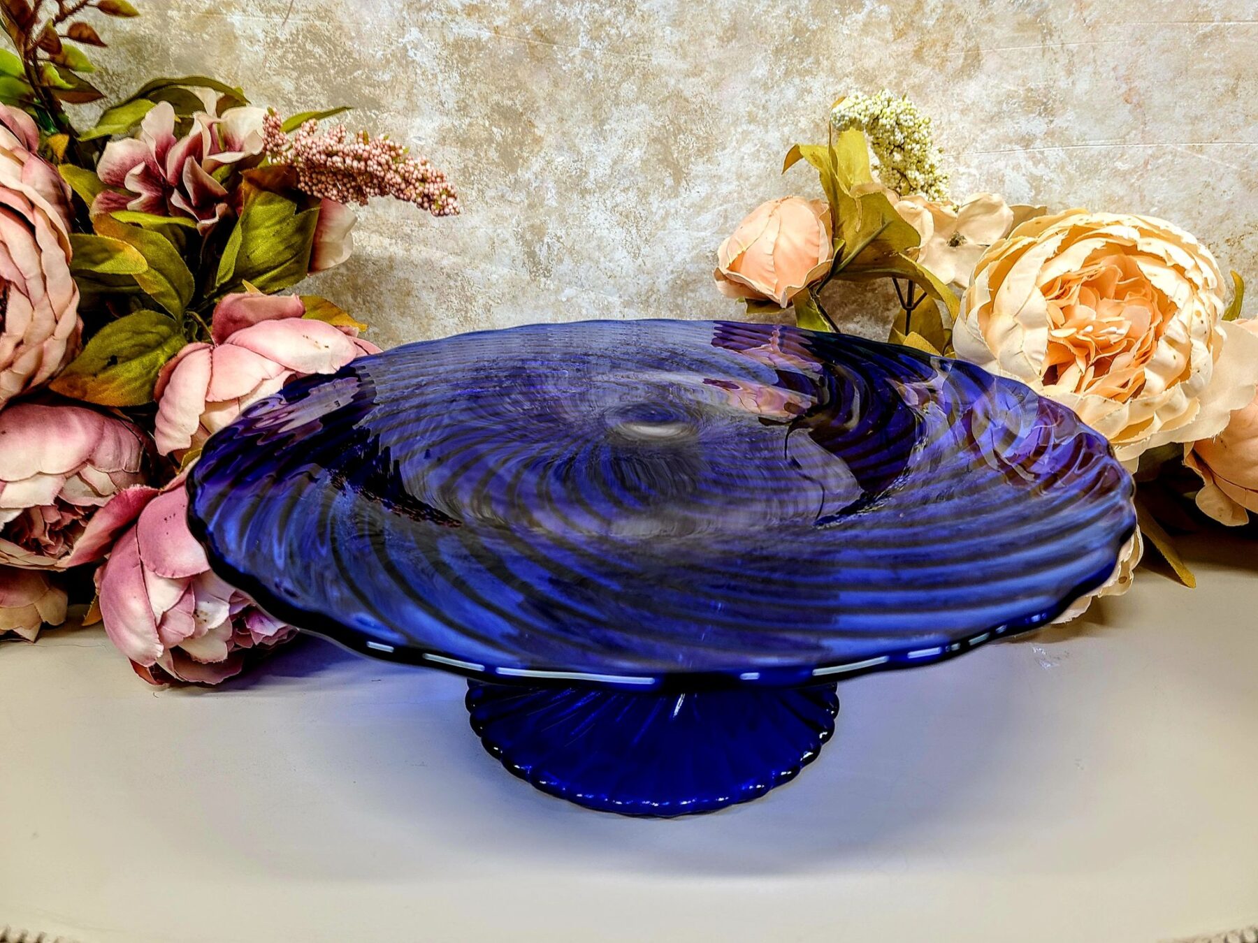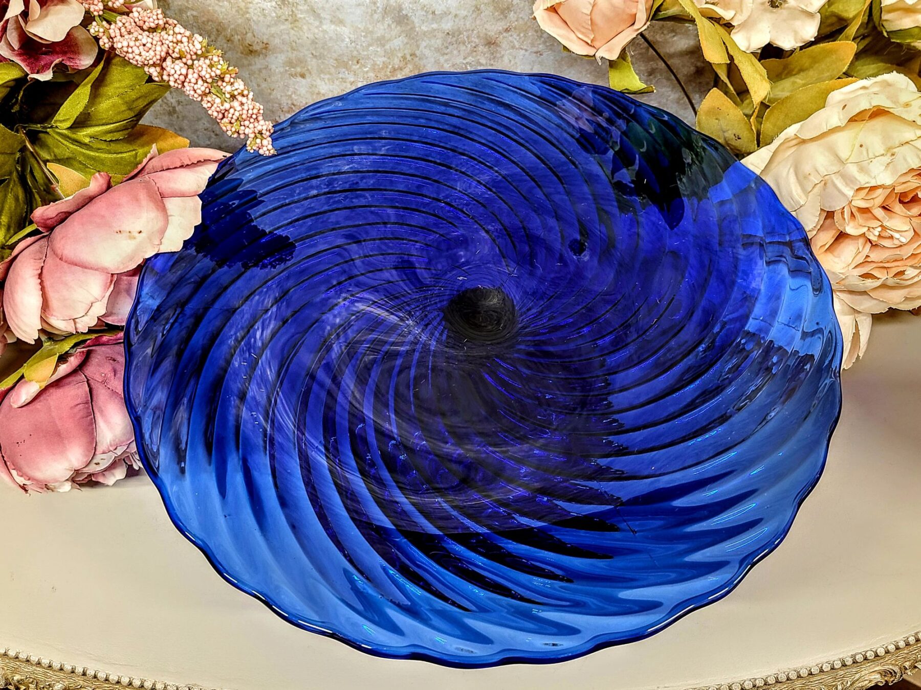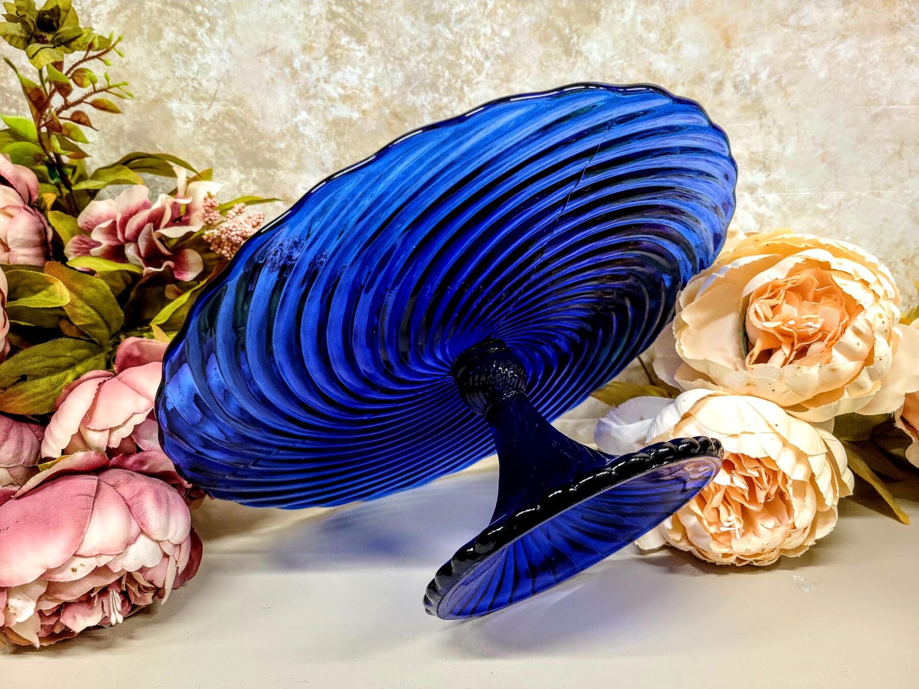 Pressklaasi sügav sinine toon toob kaunilt esile reljeefse spiraali, mis elavneb iga valguskiirega.