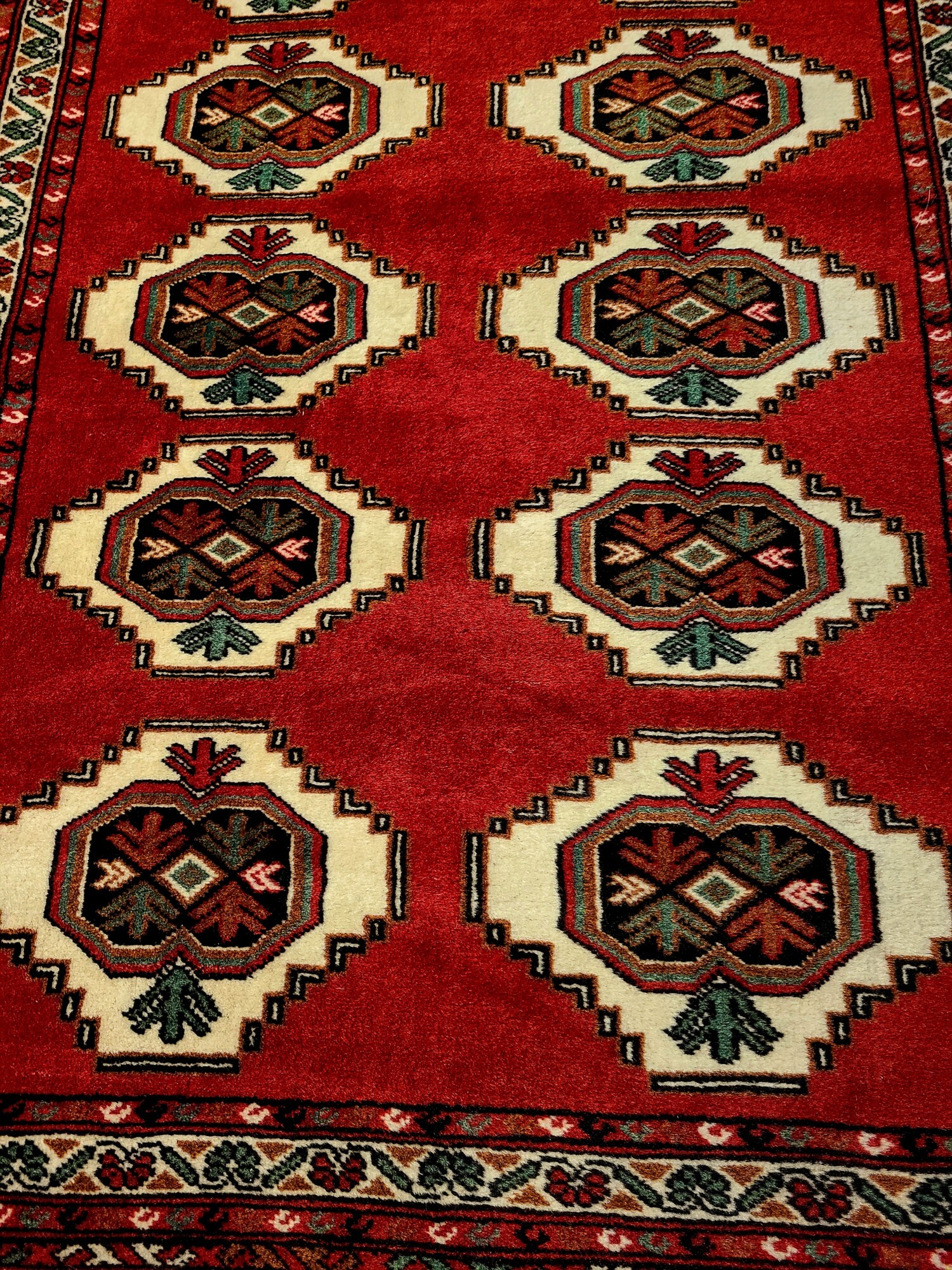 Servi raamivad mitmetasandilised äärmustrid – vahelduvad jooned, rahvuslikud geomeetrilised motiivid ja dekoratiivsed ääred, mis annavad vaibale viimistletud, ent maalähedase ilme. Põimitud narmad annavad vaibale käsitöölähedase viimase lihvi.