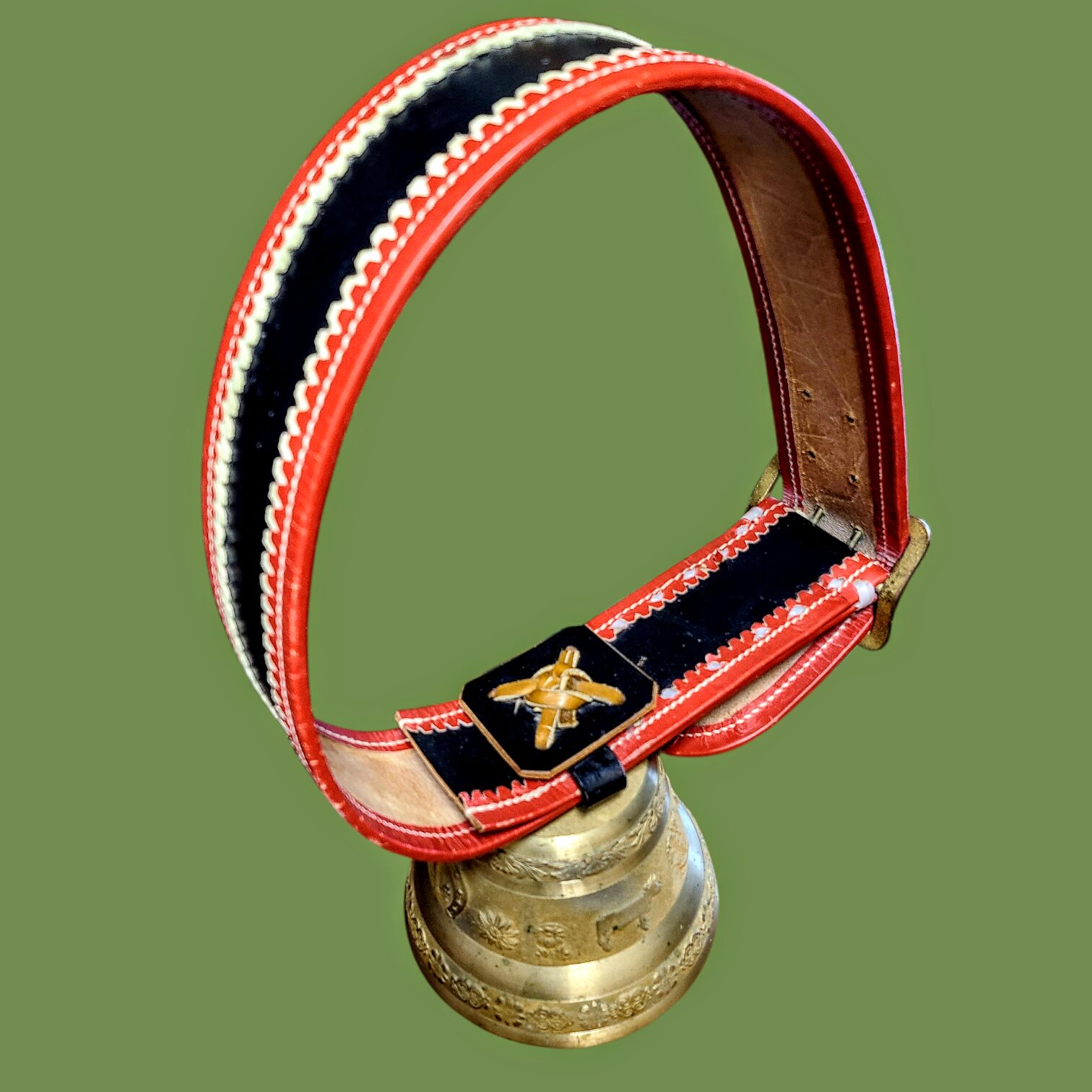 Kellaga on kaasas punane nahkrihm, käsitsi õmmeldud ja rikkalikult kaunistatud klassikaliste Šveitsi ornamentidega. Kell ja rihm on väga heas vintage-seisukorras, säilinud kauni patinaga.